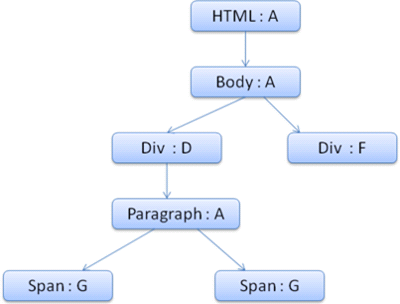 두 번째 <span> 요소에 대한 작업은 훨씬 쉽다. 맞는 규칙을 찾다보면 이전 span과 같이 규칙 트리의 G:3을 가리킨다는 결론에 이르는데 동일한 노드를 가리키는 형제가 있기 때문에 전체 스타일 문맥을 공유하고 이전 span의 문맥을 취하면 된다.