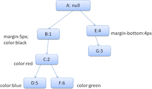 두 번째 <div> 규칙에 맞는 것을 찾으면 1, 2, 6이 되는데 이것은 요소가 사용할 수 있는 트리 경로 (규칙 트리의 B:1, C:2)가 이미 존재한다는 것을 의미하고 규칙 6(규칙 트리에서 노드 F:6)에 이르는 또 다른 노드를 문맥 트리에 추가하면 된다. 스타일 문맥을 생성하고 문맥 트리에 추가하면 새로운 스타일 문맥이 규칙 트리의 F:6 노드를 가리킨다.