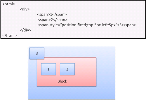 절대와 고정 배치는 일반적인 흐름과 무관하게 결정되고, 일반적인 흐름에 관여하지 않으며, 면적은 부모에 따라 상대적이다. 고정인 경우 뷰포트로부터 위치를 결정한다.