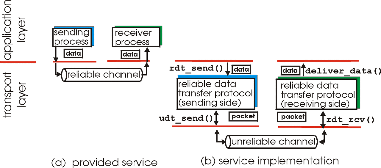 아래 그림은 신뢰성 있는 통신 서비스를 어떻게 제공해주는지 보여주는 그림이다. 신뢰성 있는 데이터 전송 함수인 rdt_send 함수는 내부적으로 신뢰성 없는 채널을 이용하는 udt_send 함수를 이용하여 구현된다.