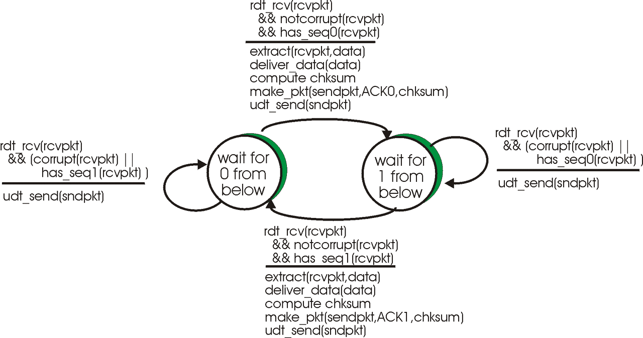 여기서 잘못된 수신에 대해서 NAK 응답이 아닌 ACK를 이용한 방법이 가능하다. rdt2.2는 NAK를 사용하지 않는 방법이다. ACK에 순서 번호를 추가함으로써 잘못된 데이터를 받은 것을 다시 송신하게 할 수 있다.
