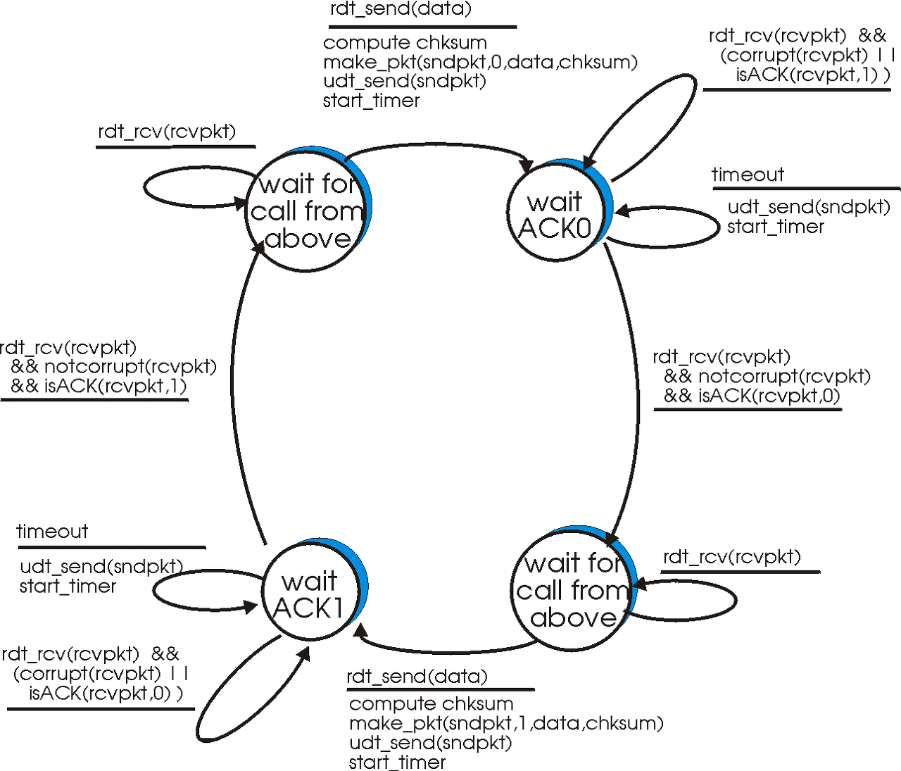 이런 식으로 송신 후 기다리기 때문에 rdt2.0은 stop-and-wait 프로토콜로 알려져 있다.