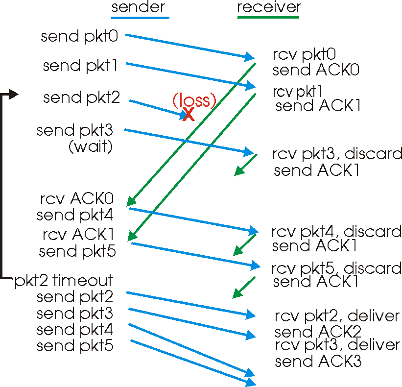 - 수신자 측에서 지금까지 성공적으로 받은 패킷 순서에 대한 ACK를 전송하며, 순서에 맞지 않는 패킷은 성공적으로 수신한 것으로 간주하지 않는다. 따라서, 송신자는 ACK를 받지 못한 가장 오래된 패킷부터 모두 재전송하게 된다.