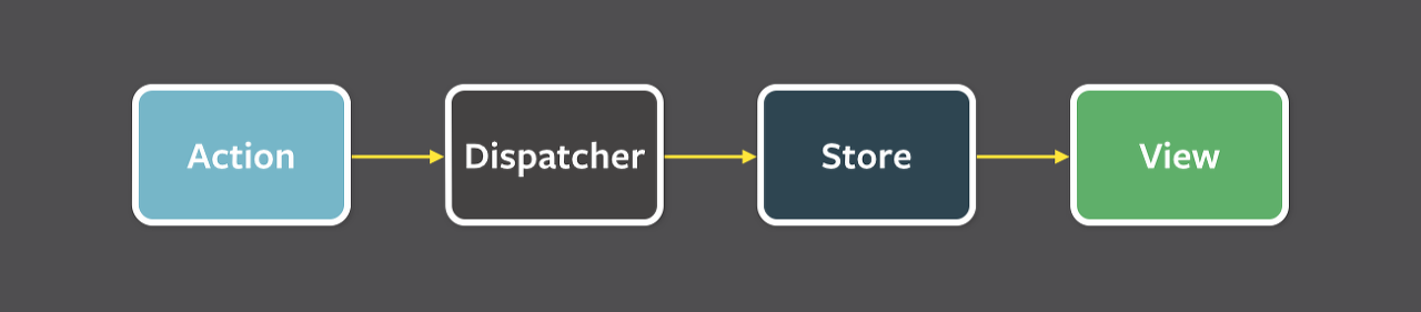 단방향 데이터 흐름은 Flux 패턴의 핵심인데 위 다이어그램은 Flux 프로그래머를 위한 제일의 멘탈 모델이 된다. dispatcher, store, view는 독립적인 노드로 입/출력이 완전히 구분된다. action은 새로운 데이터를 포함하고 있는 간단한 객체로 type 프로퍼티로 구분할 수 있다.