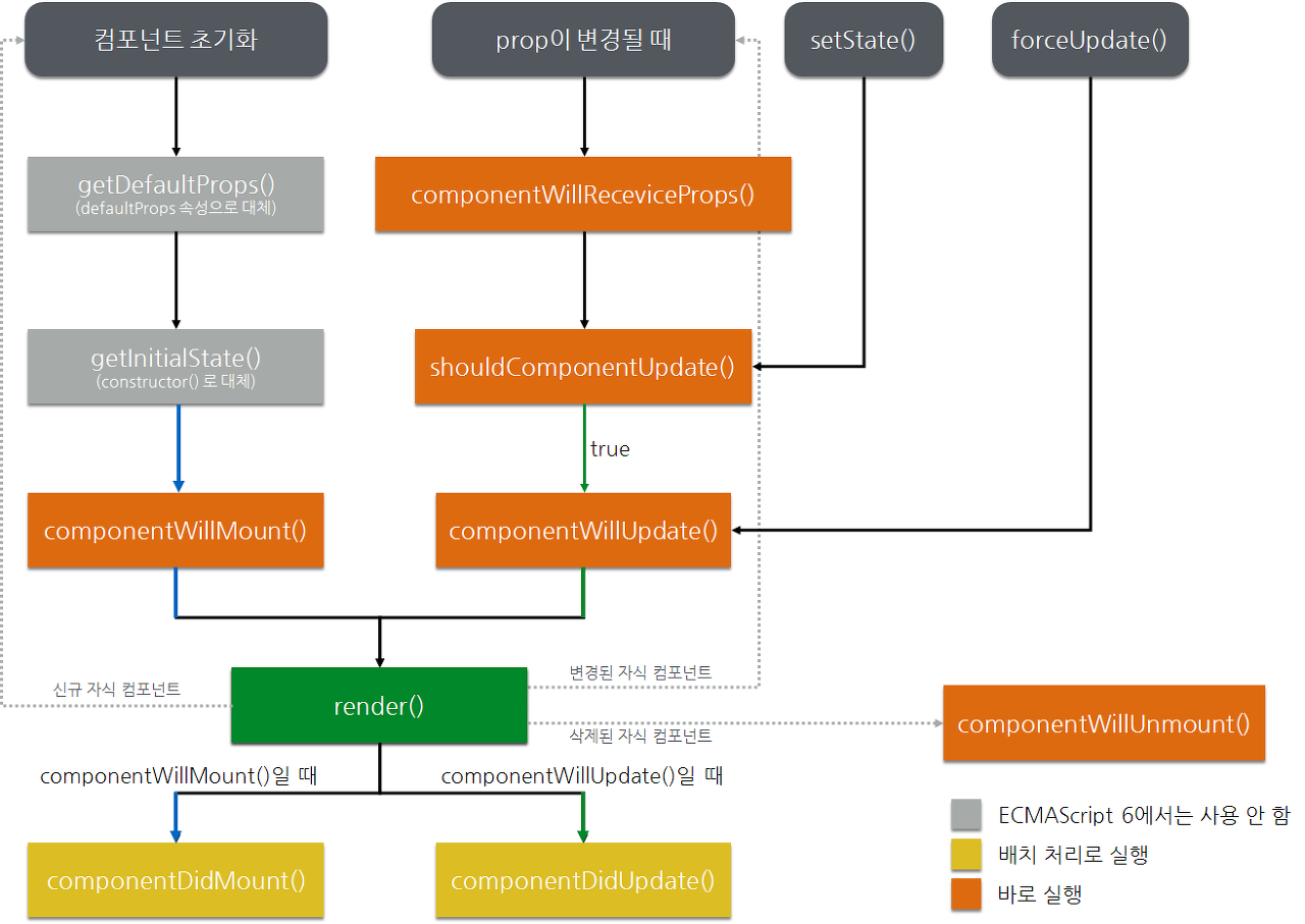 이 작업은 고비용 작업이기 때문에 componentWillMount() 메서드와 componentDidMount() 메서드에서 state를 변경하는 것에 대해서 고민해야 한다. 만약 componentWillMount() 메서드에서 state를 변경해야 한다면 컴포넌트의 생성자에서 처리하는 것이 좋다. 그리고 componentDidUpdate() 메서드에서 Virtual DOM을 갱신한다면 무한 루프에 빠질 수 있으니 조심해야 한다.